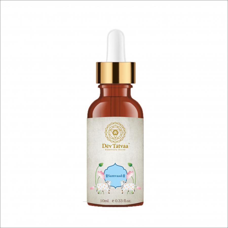 Add to Cart Communication Samvaad Blended Diffuser Oil In today's era, various forms of digital communication have greatly increased. Despite the increase in choices and specificity, people still fall prey to misunderstandings in their relationships. Suppressed emotions cause stress as well as other psychosomatic disorders, one of them majorly concern being Thyroid. Samvaad helps you to express yourself in various arenas of your personal and work life. When the goal is to enhance multiple people or an entire space, diffuser oils are the best option you have. All you need put a few drops of the chosen oil in the diffuser and enjoy the benefits with your partner, friends, family or colleagues. Benefits: It increases compassionate communication. It helps to entrust the unfolding of events in life. It promotes self-communication as well as communication with society. It relieves overanalytical nature. Helps to declutter your life as well as thoughts. Key ingredients: Orange, Chamomile, Cedarwood, Holy Basil, fortified with a secret divine tatvaa and love. How to use: Put 8 - 10 drops in the diffuser Switch on the diffuser and keep it on till desired. These oils are concentrated, not meant for topical use. Who can use: People facing communication issues. People not able to put forth their ideas in an effective manner. People having issues with self-communication. Can be used in homes, offices, hospitals, trauma centres, etc. Caution: People allergic to natural oils should avoid direct contact. Pregnant women and kids below 7 yrs. should refrain from using essential oils. Avoid direct contact with eyes. Store in cool & dry place, away from sunlight For external use only. Actual packaging may vary from the picture shown above. (Add this below the product matter for all products) ₹ 1,500.00 Add to Cart