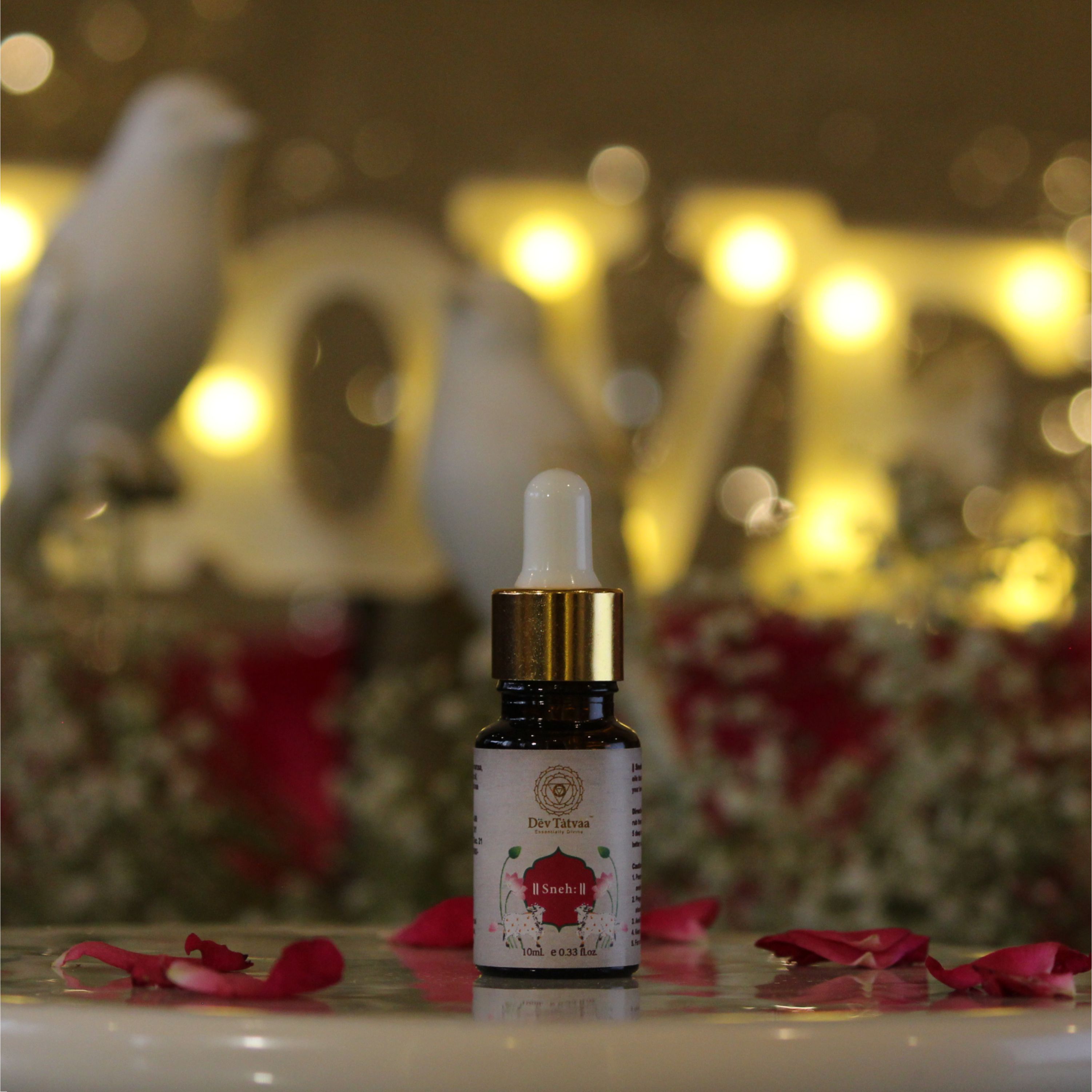 Add to Cart Love Sneh Blended Oil Love comes in various forms. When one is able to love unconditionally, a major transformation is seen in relationships with self and others. Sneh helps to increase love and bonding between couples. Convenience is a privilege. When you're on the move and don't have the time or space to use a dropper bottle, Roll-ons come to the rescue. Just apply a bit on your palms, inhale the aroma with deep breaths, and you're good to go. Benefits: It removes anxiety and emotional crisis It balances extreme mood swings. It promotes self-love and unconditional love towards others. Key ingredients: Geranium, Palmarosa, Mandarin, Bergamot, Jojoba oil, fortified with a secret divine tatvaa and love. How to use: Rub enough oil on wrists and palms. Inhale the aroma with deep breaths 4 - 5 times. Use it twice a day for better results. Who can use: People undergoing trauma and emotional crisis. People with lack of self-love. Healers as they tend to absorb emotions of others. Caution: People allergic to natural oils should avoid direct contact. Pregnant women and kids below 7 yrs. should refrain from using essential oils. Avoid direct contact with eyes. Store in cool & dry place, away from sunlight For external use only. Actual packaging may vary from the picture shown above. (Add this below the product matter for all products) ₹ 900.00 Add to Cart