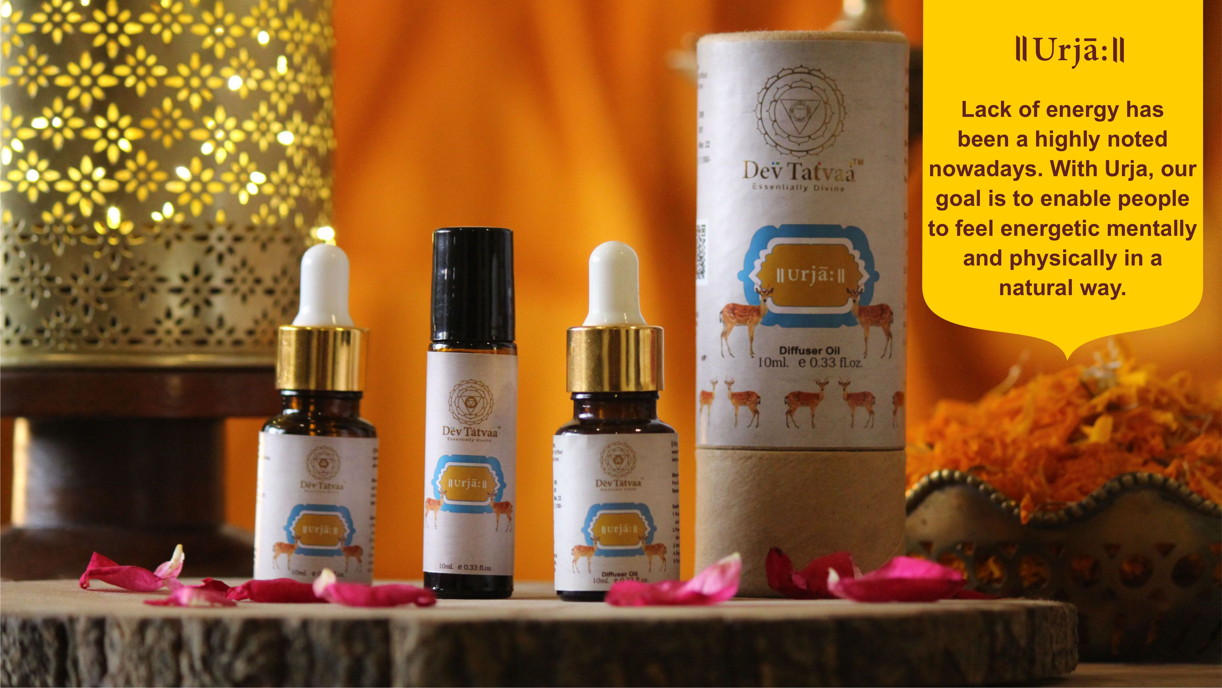 Add to Cart Energy Urja Blended Diffuser Oil Lack of energy has been highly noted in today's world. Although the reasons are several, ranging from improper sleep cycles, poor diet, stress to blue light radiation, etc. Working on these causes can seem like a mammoth task. With Urja, our goal is to enable people to feel energetic, mentally and physically in a natural way. When the goal is to enhance multiple people or an entire space, diffuser oils are the best option you have. All you need put a few drops of the chosen oil in the diffuser and enjoy the benefits with your partner, friends, family or colleagues. Benefits: It increases physical as well as mental energy. It enhances sense of security and grounding. It uplifts mind and spirit. It strengthens will power, activates initiative and restores determination. It rekindles fire within our soul and helps to regain lost passion for life. Key ingredients: Nutmeg, Cypress, Grapefruit, Ginger, Spearmint, fortified with a secret divine tatvaa and love. How to use: Put 8 - 10 drops in the diffuser. Switch on the diffuser and keep it on till desired. These oils are concentrated, not meant for topical use. Who can use: People who have lost the passion for life. People who get tired very soon. People who has high pressure jobs. People recouping from chronic illness. Can be used in homes, offices, hospitals, trauma centres, etc. Caution: People allergic to natural oils should avoid direct contact. Pregnant women and kids below 7 yrs. should refrain from using essential oils. Avoid direct contact with eyes. Store in cool & dry place, away from sunlight For external use only. Actual packaging may vary from the picture shown above. (Add this below the product matter for all products) ₹ 1,100.00 Add to Cart